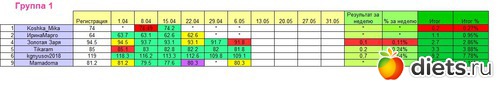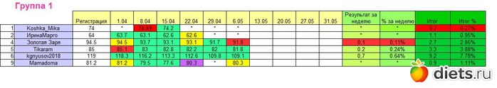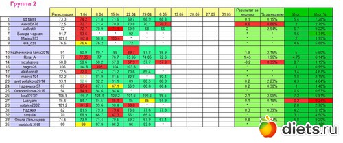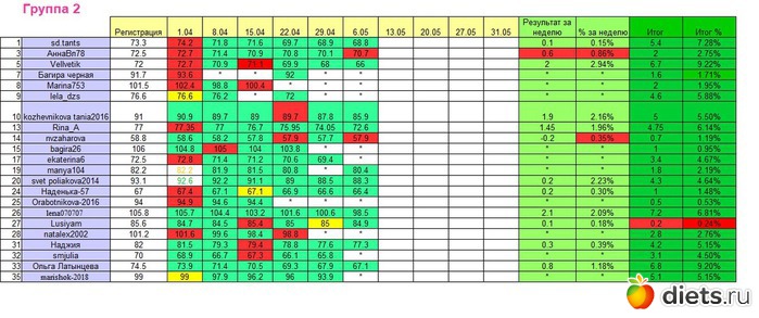 В таблице зелёный цвет значит потерю кг, красный - набор, жёлтый - без изменений.