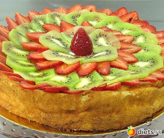 Остудить торт в течение 4-х часов, украсить тонко нарезанными фруктами.