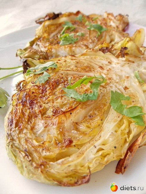 И подаём! Печёная капуста очень вкусна в тёплом виде - особенно здорово положить на ломтик капусты отбивную, получается интересный бутерброд!