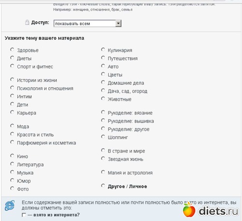 Я в группу хотела запись опубликовать. потом в дневник..Так даже в черновик не смогла занести. Удалила запись...И теперь в раздумьях - а стоит ли трепыхаться? Не писала. ну и не стоит начинать..