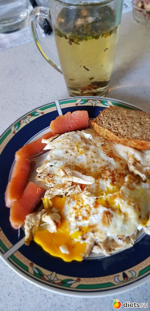 Яйца с отварной на пару в специях куриной грудкой,филе красной рыбы(вечно забываю как её обзывают) и хлебушек отрубной.Чай травяной без сахара.