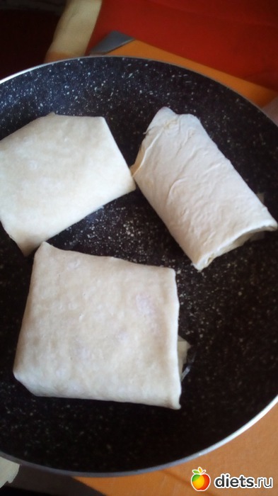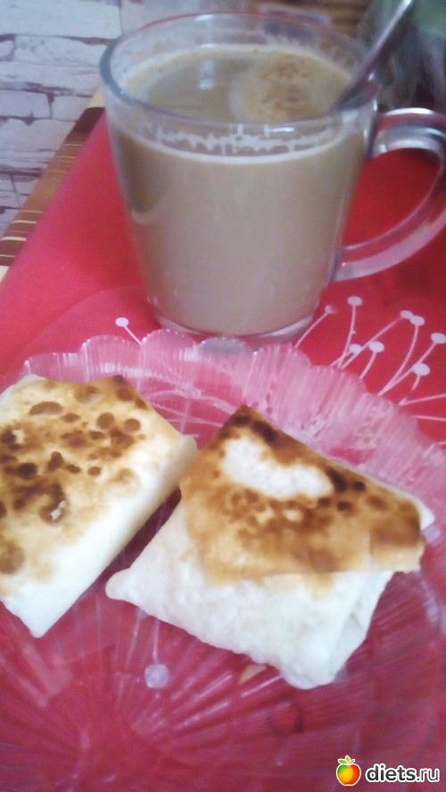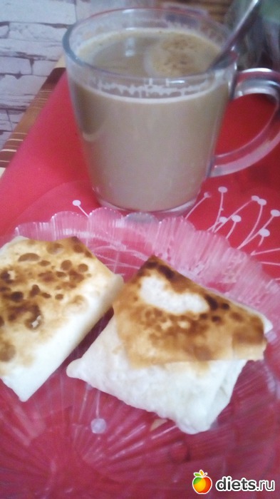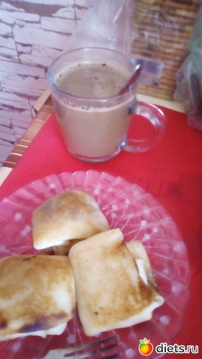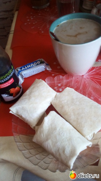 (начинка в них разная-у меня и у мужа. У меня-просто разогретые в микроволновке и с клубничным соусом-бальзамиком, у мужа-обжаренные на сковороде с маслом)