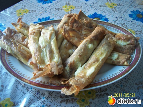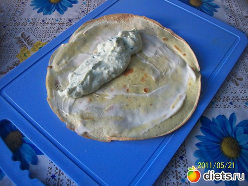 смешиваем очень тщательно (я делаю это в миникомбайне) 6 яиц, 6 ст. ложек молока, 0,5 ч. л. соли, 1 ст. л. муки и черный перец на Ваш вкус. Выпекаем блинчики и смазываем их тем что есть под рукой (сметаной, майонезом, маслом), т. к. они очень тонкие и хрупкие, а впоследствие их придется сворачивать. Думаю, что наиболее диетичным будет смазать сметаной.