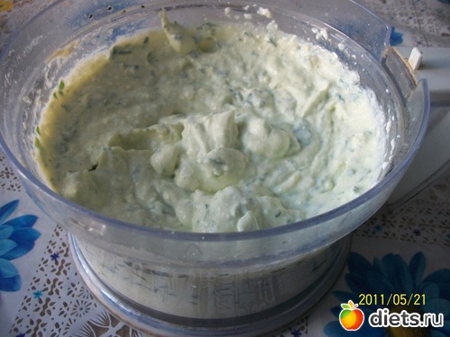 Далее готовим начинку. Я делаю такую, чтобы не навредить фигуре. 250гр. обезжиренного творога, 2 яйца, три зубчика чеснока, немного зеленого лука. Все смешиваю в комбайне. Получается такая зеленоватая смесь