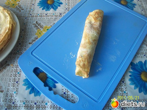 Теперь фаршируем блинчики, но не конвертиком, а рулетиком.