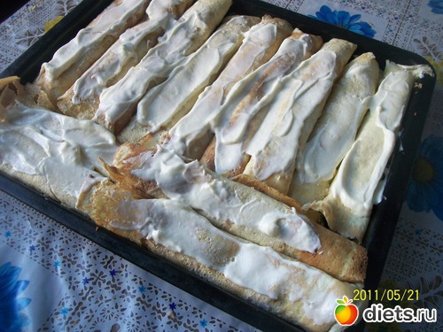 На смазанный противень укладываем блинчики и смазываем сверху майонезом.