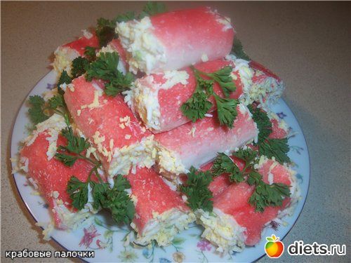 Выложить на блюдо, посыпать сверху желтками и украсить зеленью укропа (для того, чтобы сверху желтки хорошо прилипли к поверхности палочек).