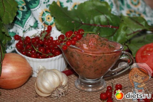 Соус из свекольной ботвы хорошо сочетается с овощными блюдами и мясом. В его составе свежая зелень, сочные помидоры, красная смородина и букет пряностей. Гармоничное сбалансированное сочетание овощей и ягод обладает пикантным вкусом. Известно, что ботва свеклы гораздо полезнее, чем сами корнеплоды. В листьях молодых растений содержится в разы больше витаминов и микроэлементов. Правда, использовать в пищу нужно только что сорванное, не успевшее завянуть сырье.