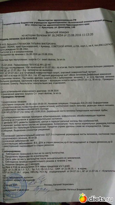я подошла к врачу, который меня должен был оперировать и сообщила эту новость, он отправил меня домой, я пробыла дома неделю, отпразновала свой день рождения, и через 3 дня поехала обратно в Краснодар, меня опять положили в ту же палату, опять анализы, узи, операцию мне назначили на 4 е сутки, вечером клизма, утром клизма и катетор в ( интимное место), в 9 утра меня забрали на операцию, которая прошла успешно, мне вырезали кисту вместе с правым яичником
