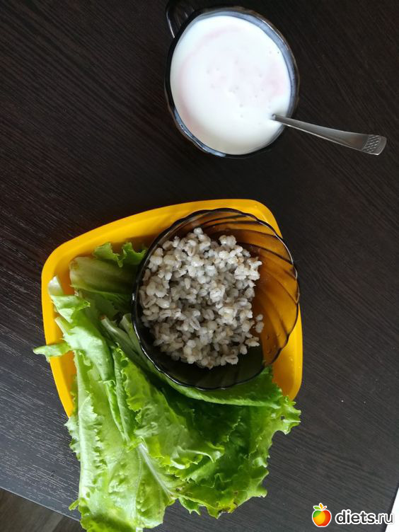 Завтрак : Перловка 100 гр.+ 1 ч. л. рост. масла, лист салата 10 шт., кефир 150 мл.+ 2 ч.л. клубнич. варенья.