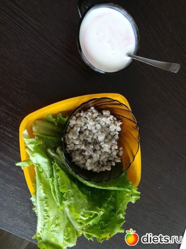 Завтрак: 100 гр гречки с 150 мл.молока. листья салата 9 штук, чай с молоком
