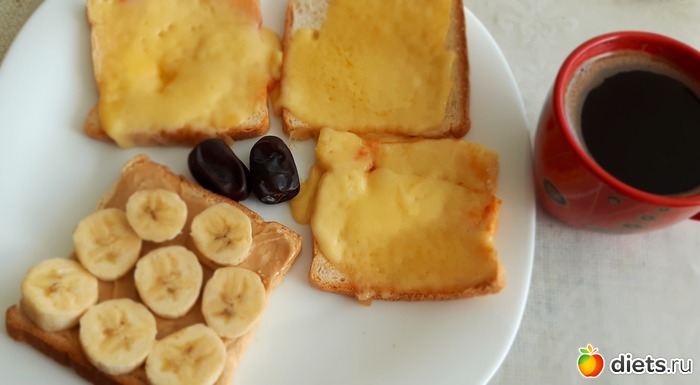 Бутерброды с сыром и арахисовой пастой с бананом, финики, кофе.