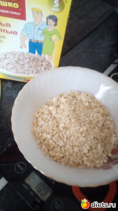 Берем 100 гр овсяных хлопьев, заливаем 100 мл кипятка и перемешиваем, оставляем на 15 минут, дадим набухнуть хлопьям.