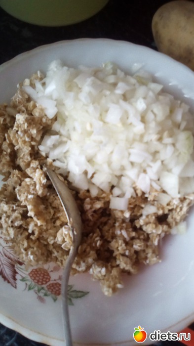 В миску перекладываем подготовленные овсяные хлопья, картофель, лук с чесноком, соль, немного перца.