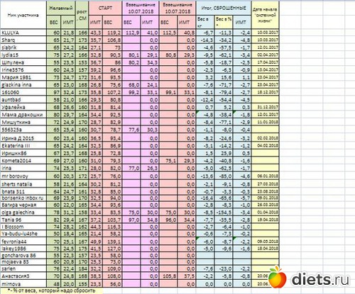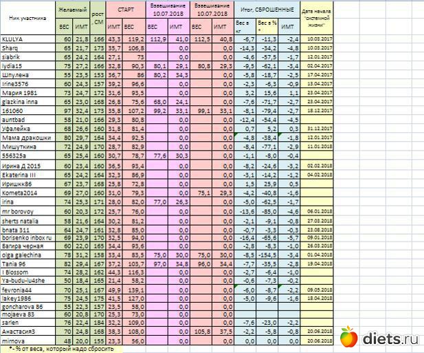 Diets.ru Таблица веса участников группы за 17.07.2018