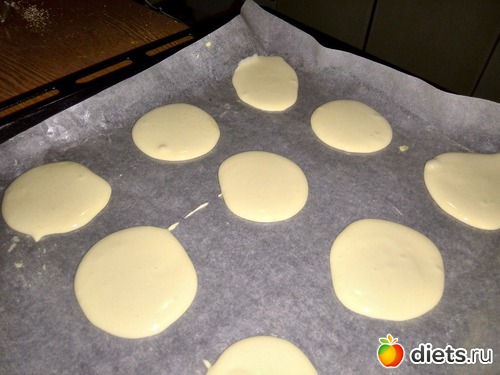 И ложечкой "выливаем" на противень, смазанный маргарином или сливочным маслом, я люблю на пергаментной бумаге выпекать