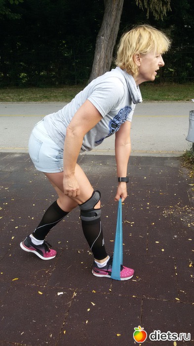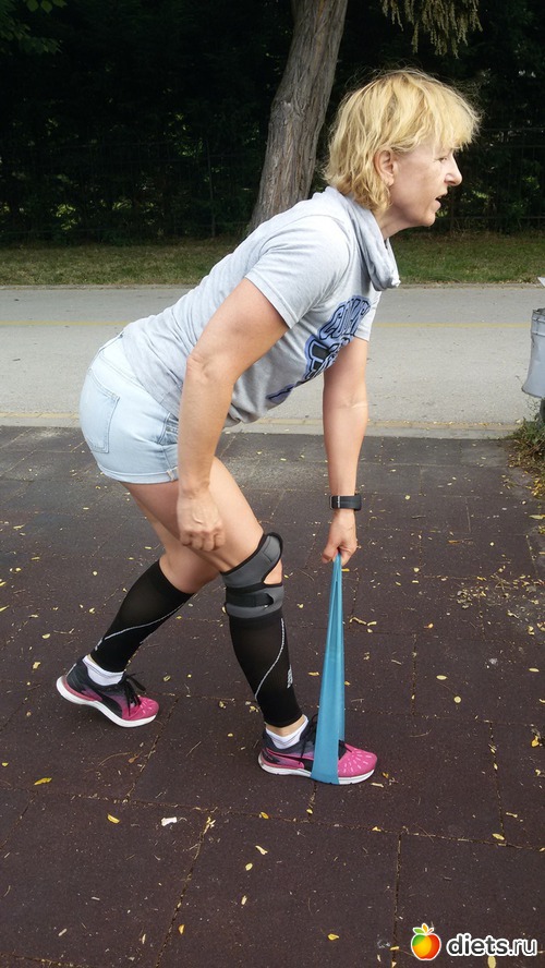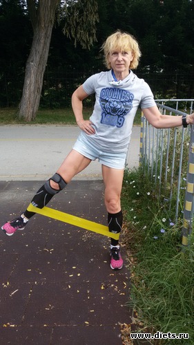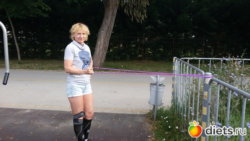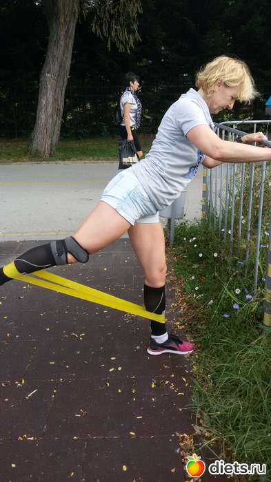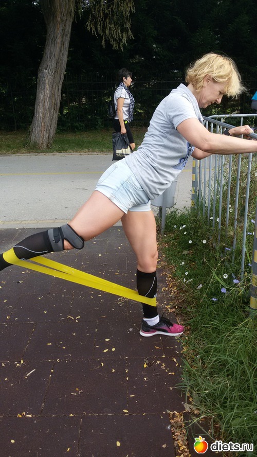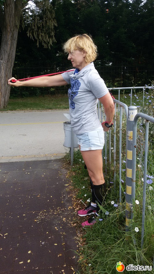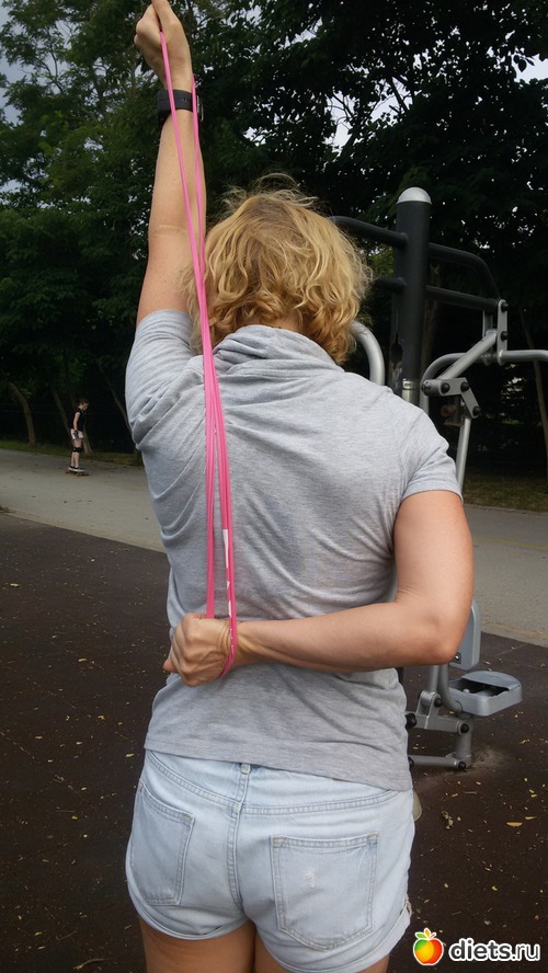 Затем 30-минутная зарядка и упражнения на растяжку. Для усиления нагрузки во время зарядки использую резинки различного натяжения. Здесь некоторые из упражнений, которые с ними можно выполнять.