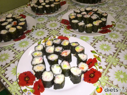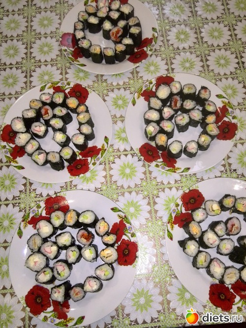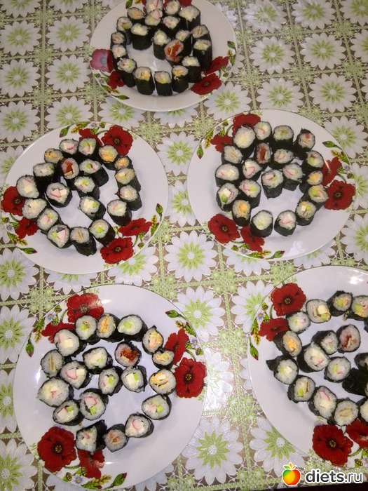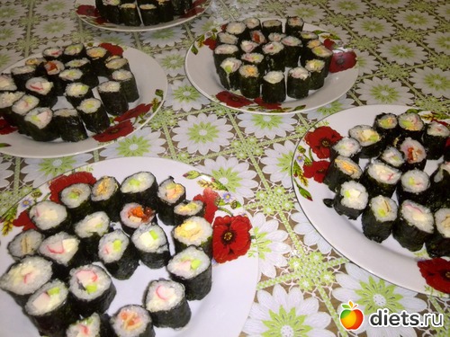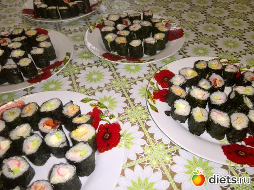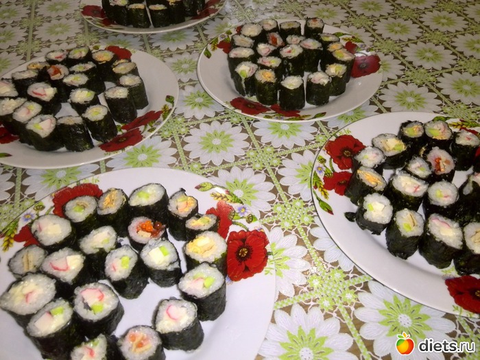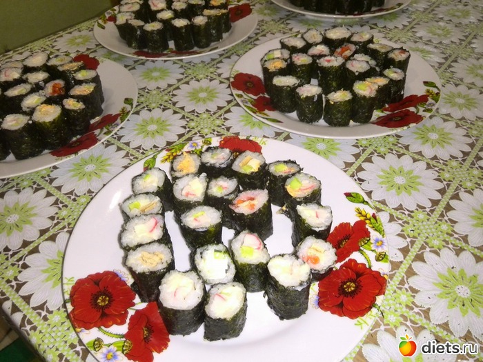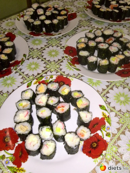 ПыСы. В первый раз я роллы крутила и красной рыбой наверх, и кунжутом посыпала. И разрезала на 4 части, а потом в лист нори заворачивала, и на разрезе был рисунок. Но сейчас не заморачиваюсь, ведь по вкусу нравится то, что попроще. Лучше провести время за беседой или просмотром фильма с друзьями.