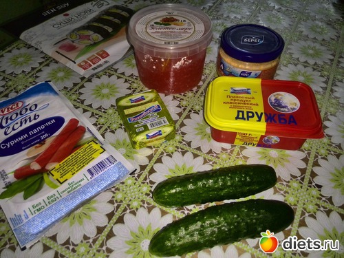 1) сливочный сыр Креметто, (примерно 900р 2кг, продается на развес), красная рыба слабосоленая, огурец, рис, нори