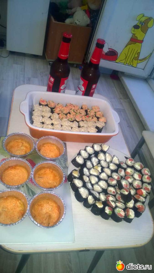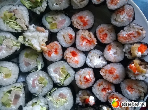 1)красная рыба+рис+нори потом режу и сверху выкладываю икру масаго с майонезом и в духовку минут на 5-10