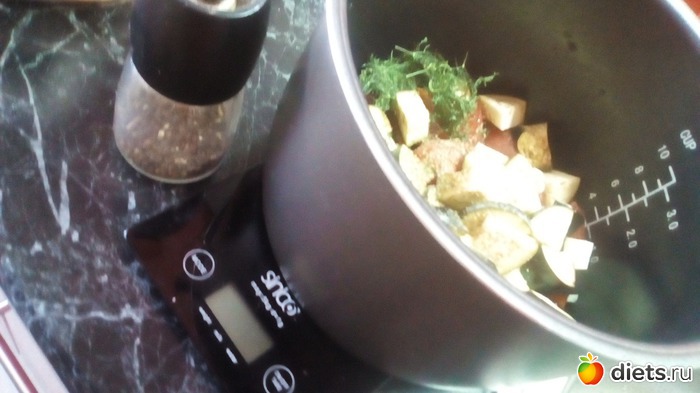 Подготовленные продукты складываем в мультиварку, солим, перчим по вкусу, добавляем подсолнечное масло, перемешиваем и ставим на режим Тушение, у меня это занимает 50минут. Если у Вас нет мультиварки, можно приготовить любым удобным для Вас способом.