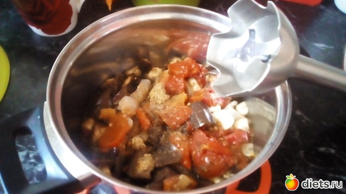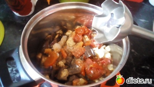 Затем овощи пюрируем погружным блендером. Если жидкости очень много, лучше немного слить, чтобы икра не получилась слишком жидкой.