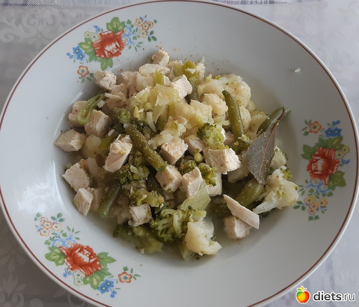 Тушёные филе, брокколи, цветная капуста, фасоль стручковая.