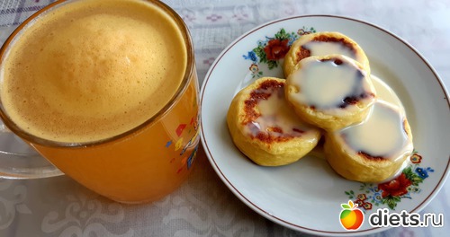Сырники, сгущёнка, морс из пенки от абрикосового варенья.