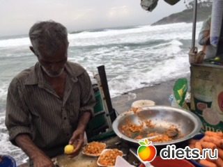 Хоть было страшновато, но подружка уже через это прошла, поэтому в последний день мы поели уличной еды. Готовят на пляже, в больших тазиках. Овощи с нутом, кукурузу со специями, жарят орешки и режут фрукты, в кокосах пробивают дырки. Местные уплетают все это за милую душу, потому что вкусно и недорого. Порции совсем не большие.