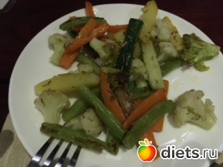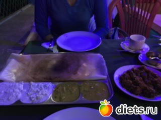 Это праздничный ужин (отмечали подружкин ДР), ужин на четверых, у меня всего понемногу, нет еще одного блюда Кадай - это разные овощи на сковороде. Здесь гоби манжуриан, торен из капусты (мелко нашинкованная, обжаренная со специями, но не острая), овощи Джай фрези ( в соусе), рис, чесночный наан (лепешка) - это все понемногу у нас в тарелке.