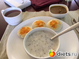 Завтраки в отеле довольно однообразны: два вида каш (овсянка с семечками чиа и тыквы и еще какая-то, я честно не поняла из чего), овощи в соусе (или нут в соусе с овощами) и какие-нибудь блинчики, обычно с подмешиванием овощей. Ну и чай травяной.