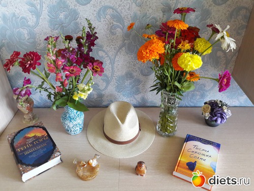 Цветы, названия книг, шляпа - это романтика, маленькие уютные фигурки - доброта и домашность, общая картина уюта, теплоты, позитива, чего-то хорошего, создавалось все с добротой и уютом!