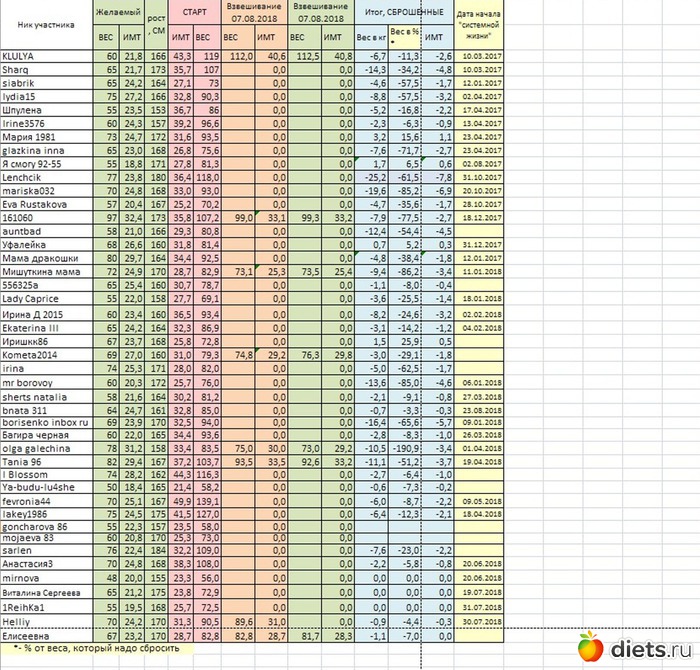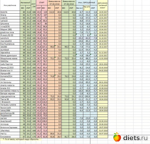 Diets.ru Таблица веса участников группы за 14.08.2018