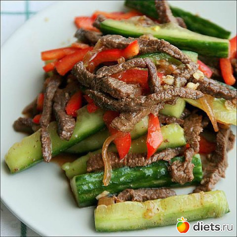 Вкуснейшая закуска, радует правильное сочетание мясо-овощи. Раньше ела в кафе и ресторанах, сегодня наткнулась на рецепт в сети и сразу приготовила. Все ингредиенты были, кроме кариандра. Без него тоже вкусно. Чуть переборщила с соей. Очень даже НУДный салатик, ведь я сахар класть не стала.