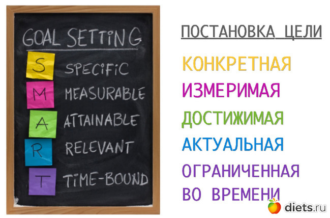 1. Конкретные - что именно мы хотим но главное - можем достичь. Если это 1 кг - значит, 1 кг, и ни грамма меньше. Если это 1 см в талии, то именно 1 см. Если мы понимаем, что минус1 кг - это для нас сейчас много, делим цель пополам! А вдруг получится? И мы с гордостью скажем, что хотели 500 г, а смогли - целый килограмм!