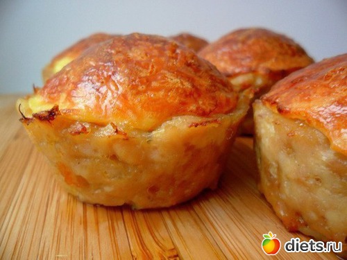 В формочки для кексов распределить в каждую ячейку одинаковое кол-во фарша. Сделать углубление.