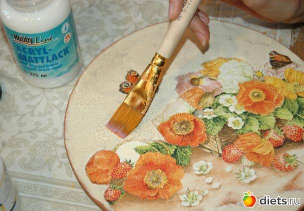 Для закрепления и устойчивости сверху покрывала акриловым лаком, так же кисть щетина плоская. Можно синтетику, но обязательно плоскую. И соответственно пошире кисть будет удобнее