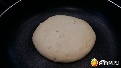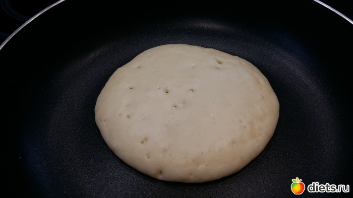 Тесто постояло минут 10-15, можно печь. На разогретую сухую сковороду выкладываю пару столовых ложек теста. Появились пузырьки переворачиваю и пеку с другой стороны. Печь на среднем огне.