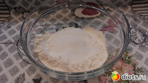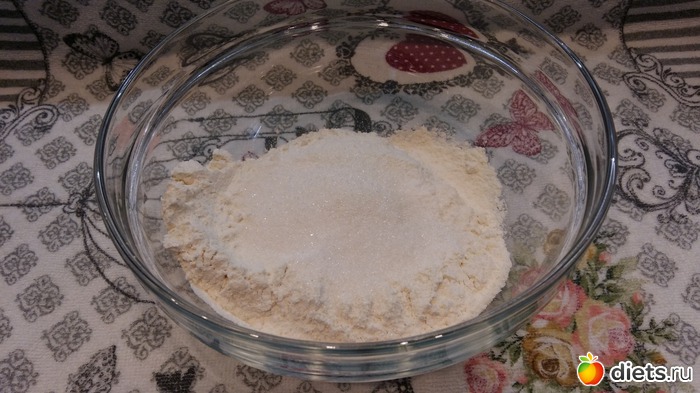 В миске смешиваю 160 грамм просеянной муки, щепотку соли, по 2 грамма разрыхлителя и соды (можно добавить что-то одно), 20-30 грамм сахара, любите сладенькое добавляйте больше. Все перемешать.