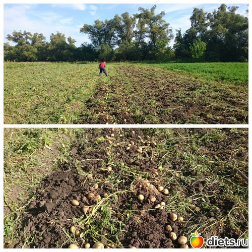 На этой неделе копали картошку, муж копает, я собираю. Справа наши сенокосные угодья, третий укос поспевает, а слева картофельная плантация