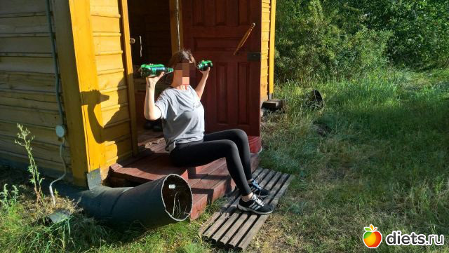 Отведения ноги в сторону 30+назад 30+вторая+жим гантелей 2 кг. сидя/20 - 4.