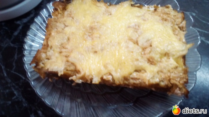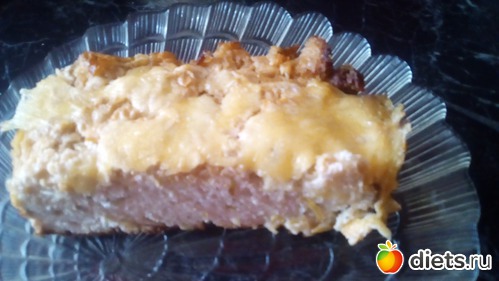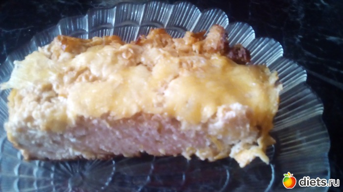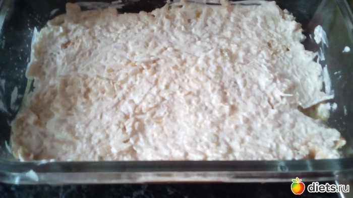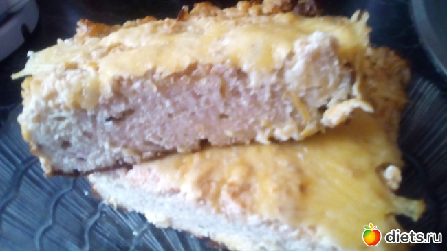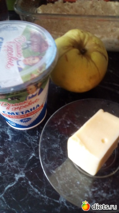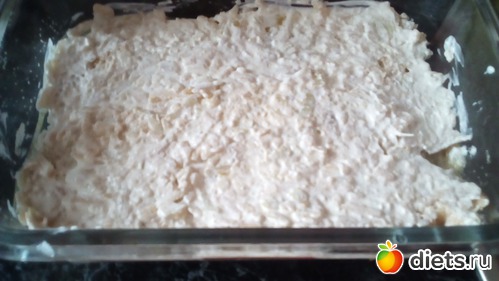3. На дно формы, смазанной маслом и посыпанной сухарями(манкой), выкладываем наш мясной слой, затем яблочно-сметанную смесь и сверху натертый сыр.(Если форма силиконовая-этого делать не требуется. Ее просто сбрызнуть водой!)