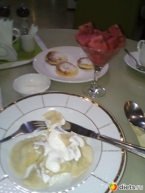 2. Питание. В командировке праздничных было хоть отбавляй))) Выбираю - крылышки гриль))) И завтрак в гостинице - вареники с картошкой, сырники и арбуз!!!