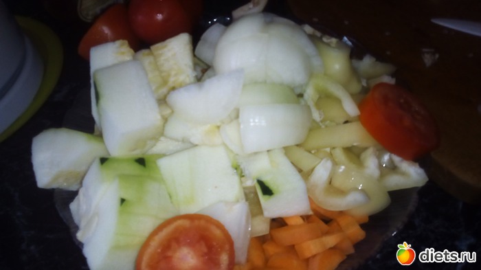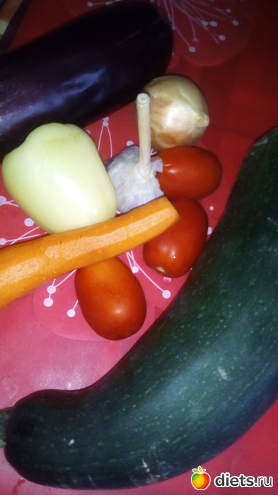 Баклажан, кабачок нарезаем кусочками, сюда же нарезаем, так как вам удобно болгарский перец, морковь, помидоры, чеснок и лук.
