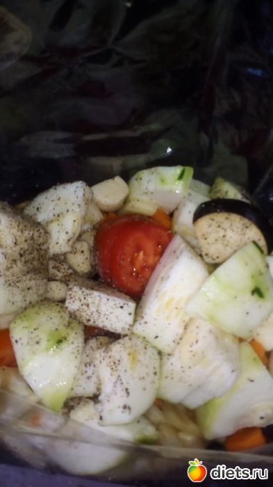 Солим и перчим по вкусу, вливаем растительное масло, перемешиваем овощи, высыпаем в рукав для запекания, и отправляем в духовку.