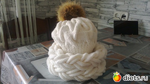 День очень насыщенный. Пришлось срочно доделать комплект шапка+снуд для племянницы. Кстати, вот и он: