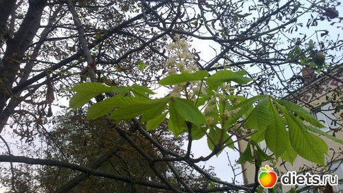 Удалось даже погулять. Одним из заданий недели было сфотографировать желтый листок, так я еле нашла листья дикой груши в парке. А сегодня возвращаемся с прогулки, а на старом засохшем каштане вот это!
