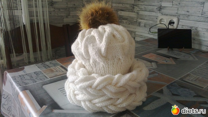 День очень насыщенный. Пришлось срочно доделать комплект шапка+снуд для племянницы. Кстати, вот и он: