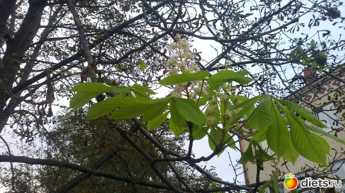Удалось даже погулять. Одним из заданий недели было сфотографировать желтый листок, так я еле нашла листья дикой груши в парке. А сегодня возвращаемся с прогулки, а на старом засохшем каштане вот это!