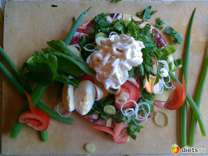 Всю эту красоту(петрушка, лук, сельдерей, щавель)я собрал заправил творогом, посолил и естественно с наслаждением съел